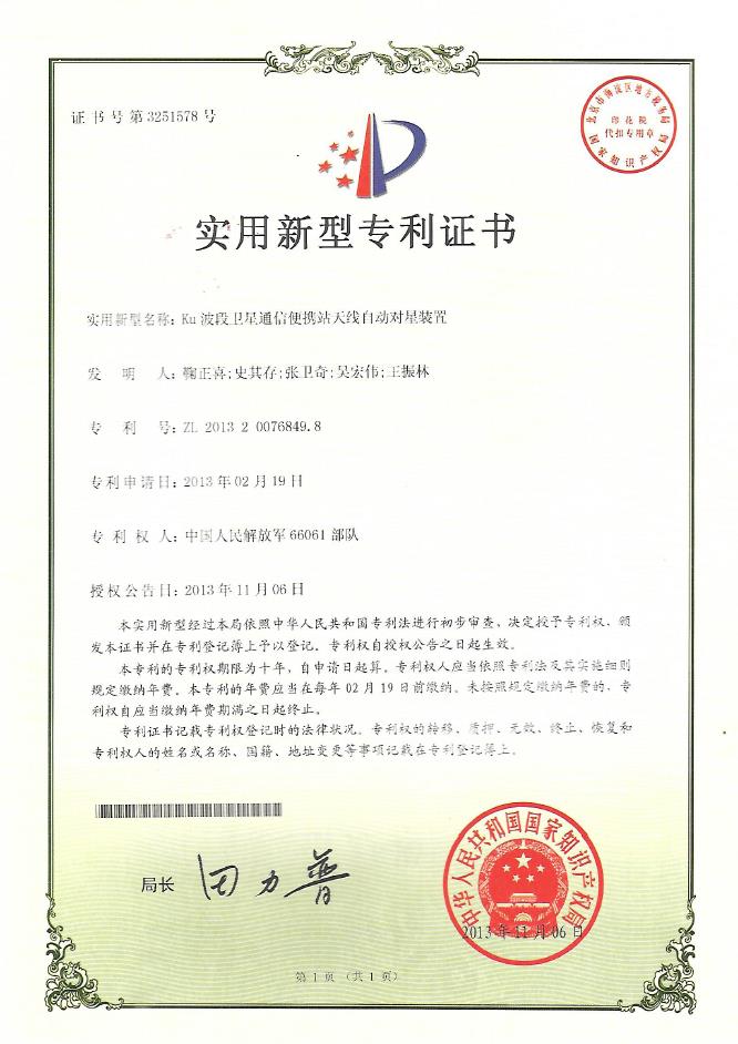 实用新型专利证书3251578:Ku波段卫星通信便携站天线自动对星装置